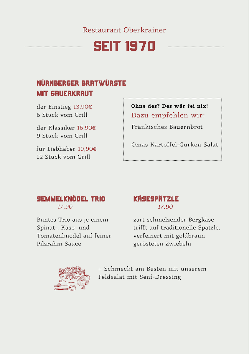 From the moment you browse their menu, you’re welcomed into a world of comforting flavors. Indulge in the Schnitzel Wiener Art, tender pork loin paired with Grandma's delightful potato-cucumber salad. The Nürnberger Bratwürste served with sauerkraut is a must-try, and the Semmelknödel Trio offers a colorful trio of dumplings in a rich mushroom cream sauce.